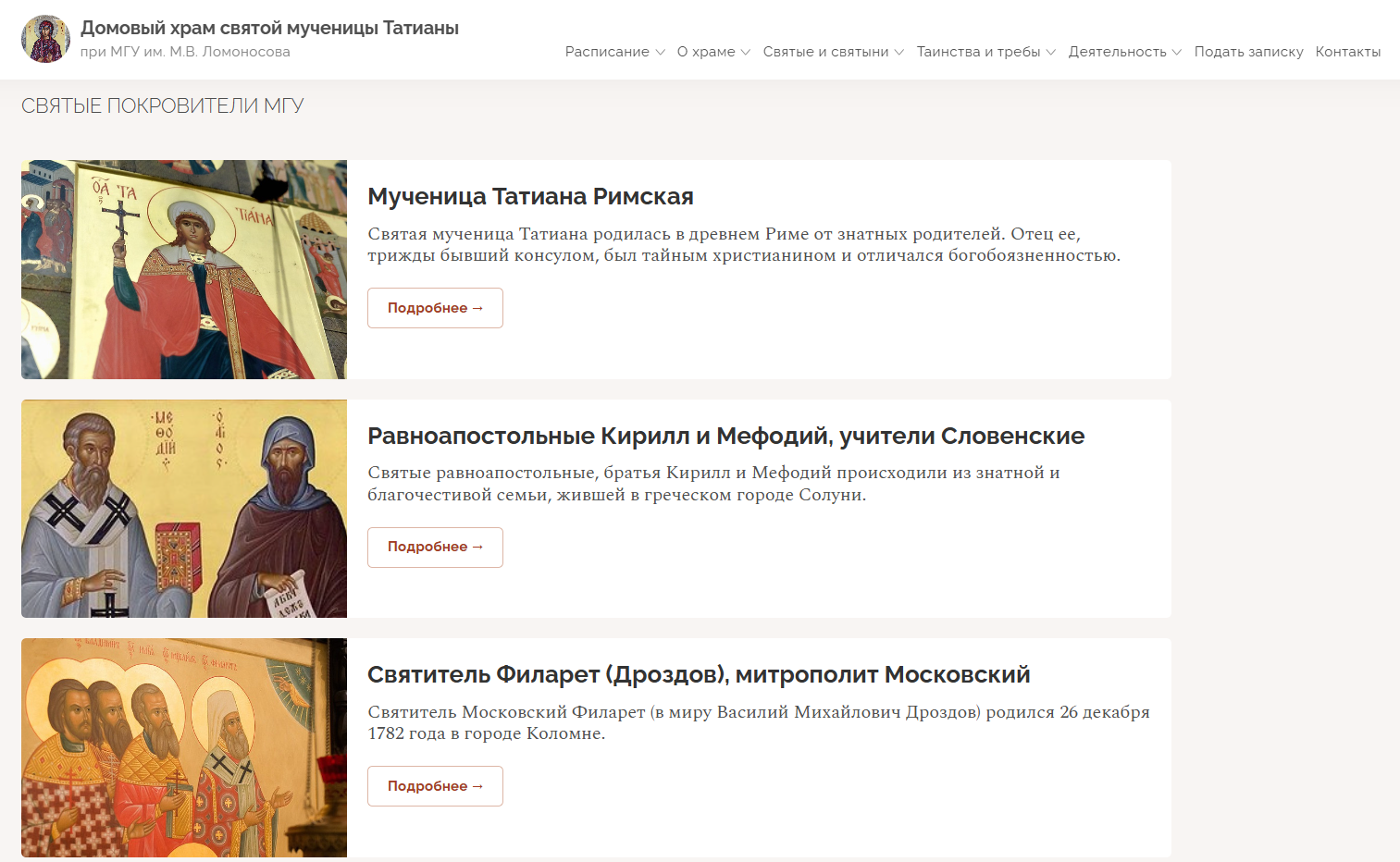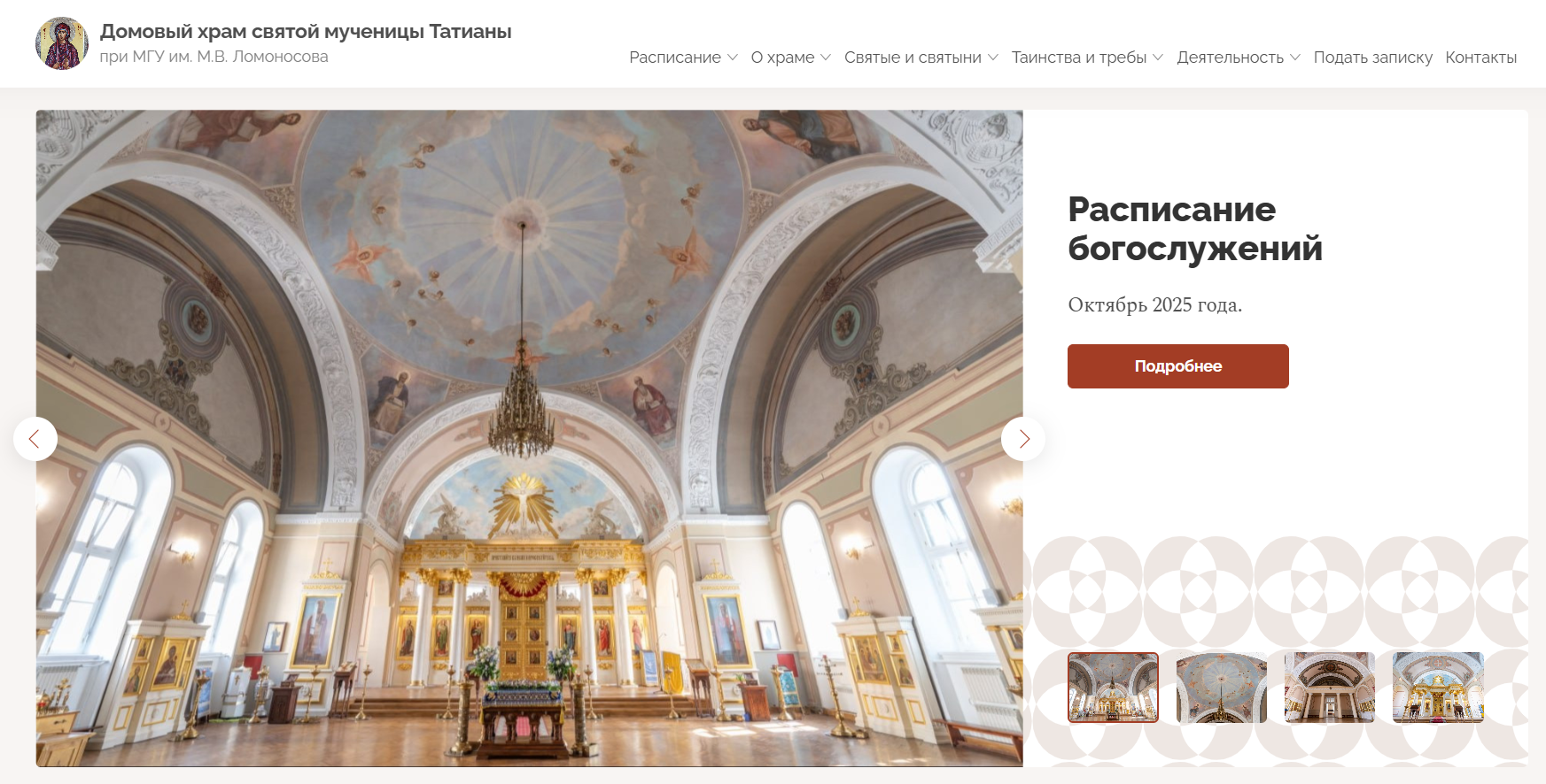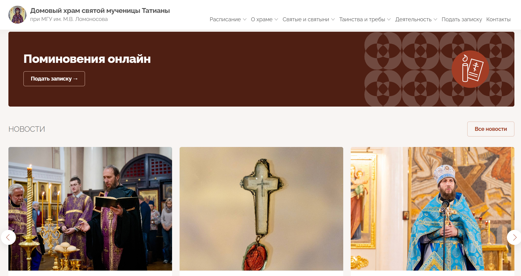 Новый сайт храма святой мученицы Татианы при Московском госуниверситете создан на нашей общецерковной платформе «Мой приход» с учётом современных цифровых стандартов и потребностей прихожан, студентов, сотрудников МГУ, а также всех, кто интересуется духовной и культурной жизнью первого университетского храма России. Дизайн ресурса стал более удобным и интуитивно понятным, навигация улучшена, обеспечена полная адаптация под мобильные устройства.